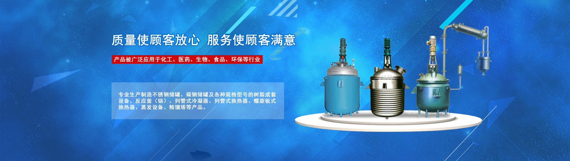 公司專業生產制造不銹鋼儲罐、碳鋼儲罐及各種規格型號的樹脂成套設備、反應釜(鍋)、列管式冷凝器、列管式換熱器、螺旋板式換熱器、蒸發設備、精餾塔等產品,被廣泛應用于化工、醫藥、生物、食品、環保等行業。